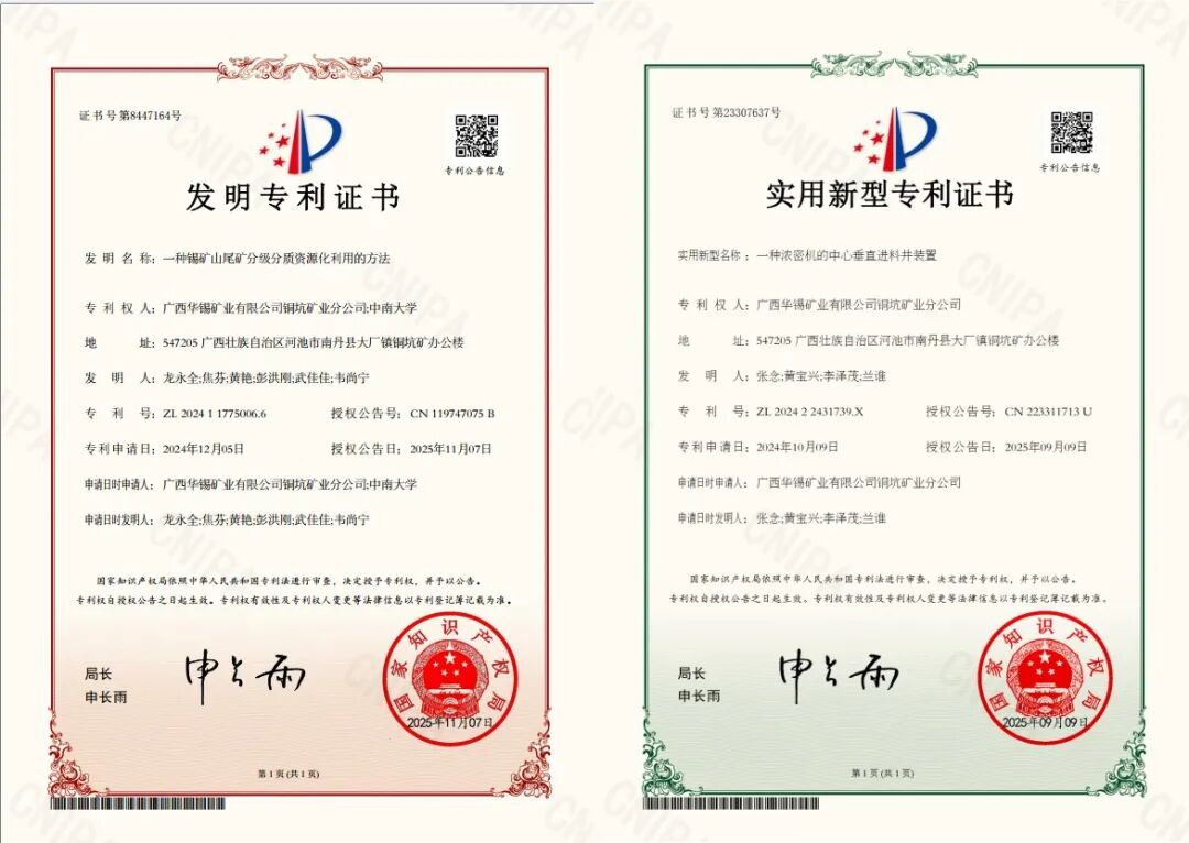 本次认证聚焦关键金属高效回收与选矿装备升级两大核心领域,取得系列创新成果。其中怀远策略,“一种锡矿山尾矿分级分质资源化利用的方法”获国家发明专利授权,有效解决了锡矿尾矿中关键金属回收与生态安全保护的协同难题;“一种浓密机的中心垂直进料井装置”获国家实用新型专利,为低品位矿石分选装备的提质增效提供了关键技术支撑。