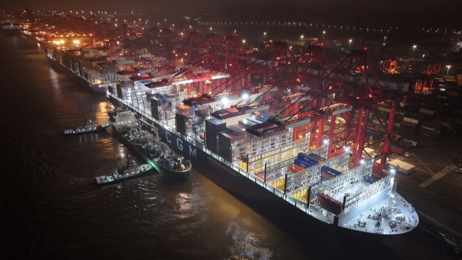 3月5日至6日,上海洋山港盛东码头,上港集团旗下上港能源为达飞集团新交付的13000TEU甲醇双燃料集装箱船“达飞欧斯米姆”(CMA CGM OSMIUM)轮成功加注国产绿色甲醇超3640吨,同步完成集装箱装卸4208自然箱。此次加注不仅圆满完成达飞集团全球首单和中国首单绿色甲醇加注,也创下国产绿色甲醇单次加注量最高纪录。