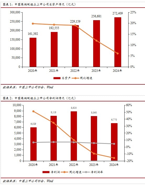 截至2024年底美林配资,高端制造业上市公司的总资产规模达到27.24万亿元,占A股上市公司总资产的6.07%,较2023年末同比增长6.13%,较2020年末增长68.79%。年均复合增长率为13.98%,高于A股整体复合增长率9.40%,资产规模增速较快。 收入规模持续增长,由2020年的9.36万亿元增长至2024年的15.41万亿元,复合增长率为13.27%,增速显著高于GDP增速,实现净利润的复合增长率为12.28%,盈利水平整体有较大提升,表明高端制造业公司仍处于快速发展阶段,表现出了强劲的发展韧性。