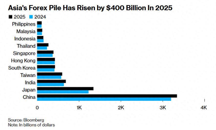 上述图表显示优配合伙人,亚洲储备资产在2025年已堆积式地增加了4000亿美元,远远高于2024年。
