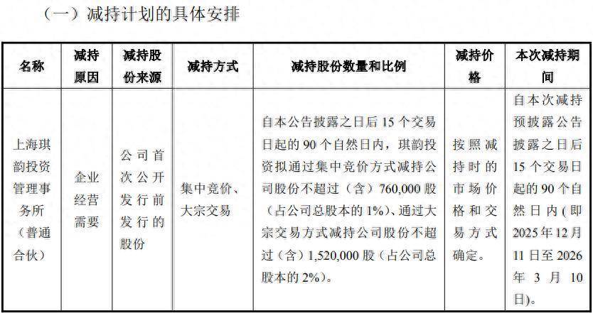 截至公告披露日,琪韵投资持有公司股份749.9979万股,占公司总股本的9.87%,是公司第三大股东。本次减持原因为企业经营需要,股份来源为公司首次公开发行前发行的股份,减持价格将按照减持时的市场价格和交易方式确定。